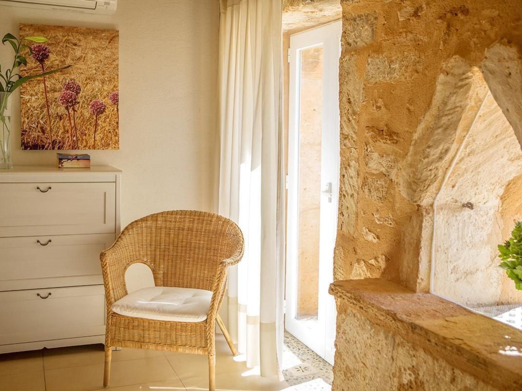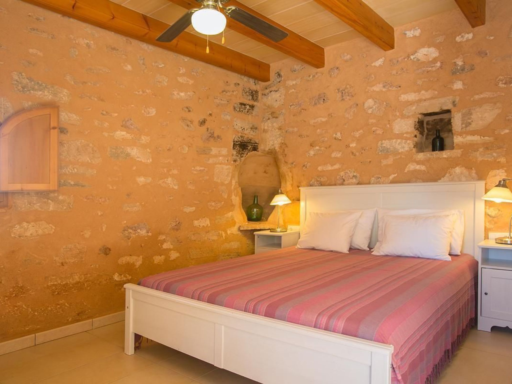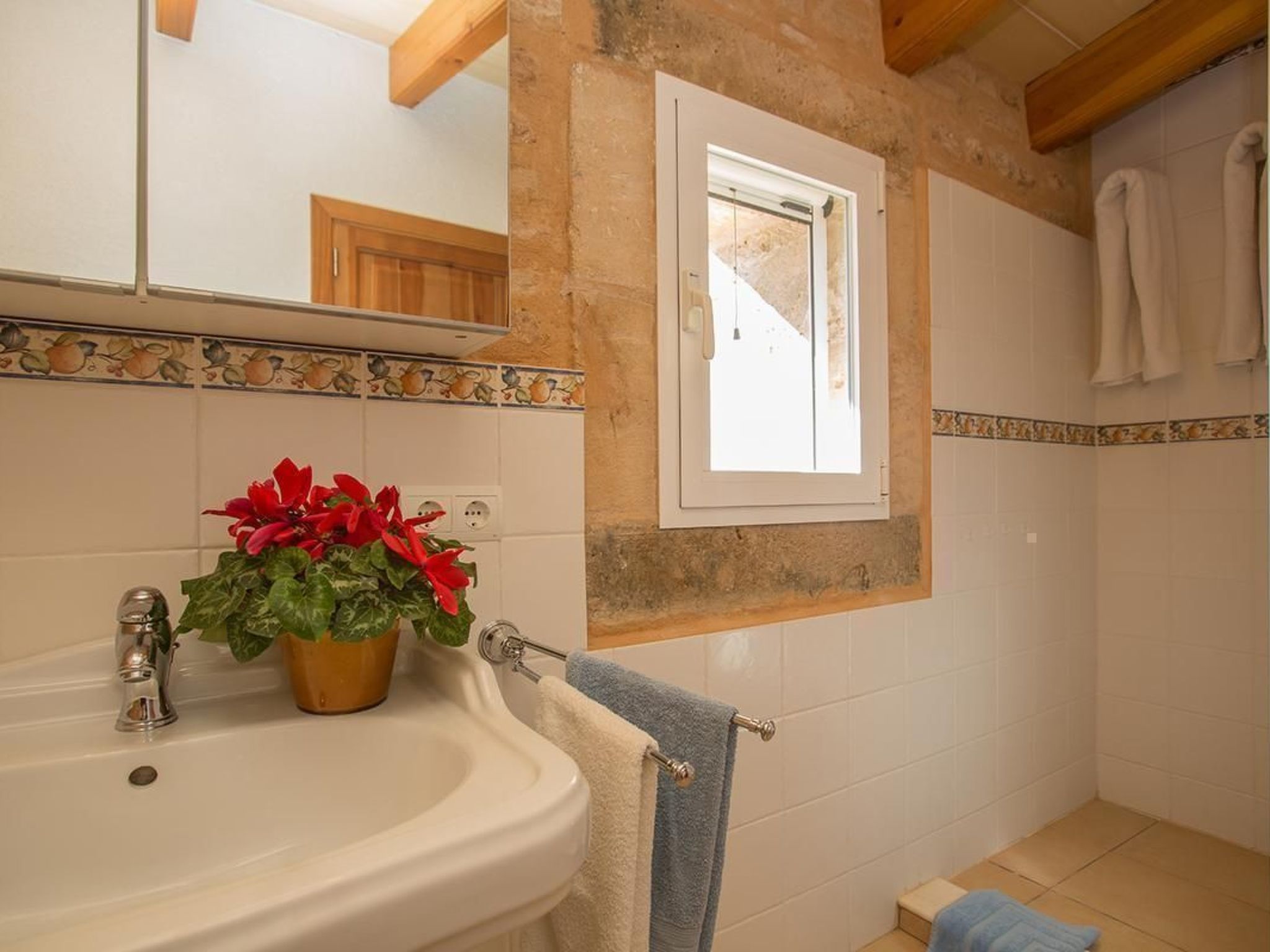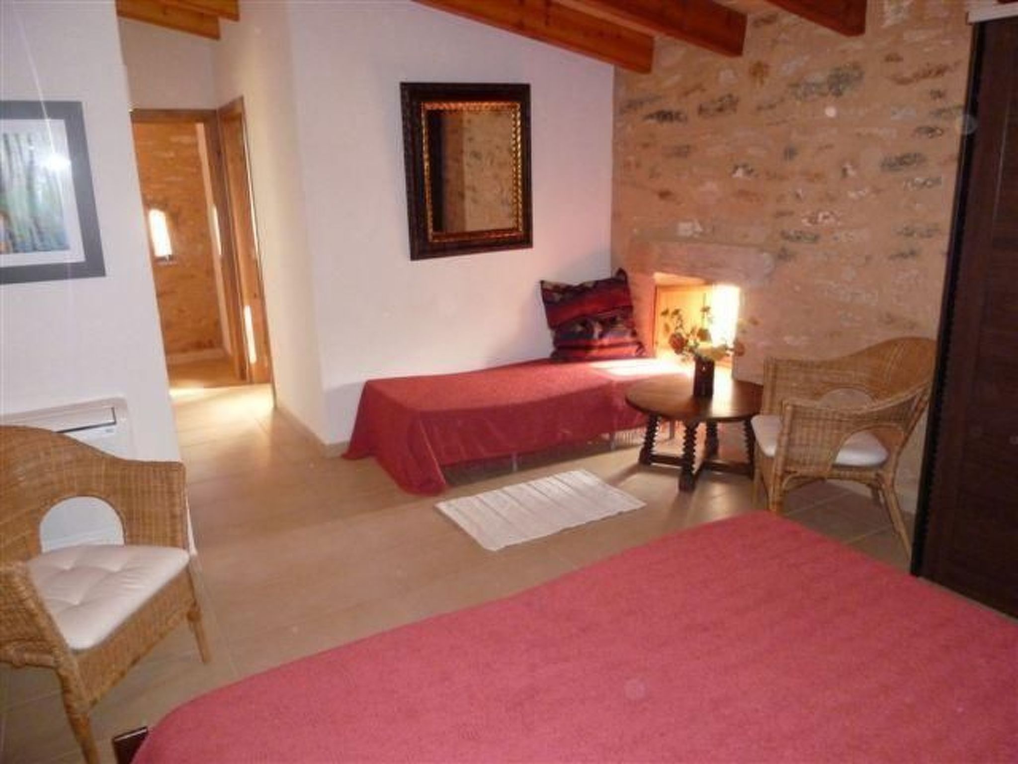 The romantic and exclusive finca is situated in a sought-after location and is newly and lovingly renovated. On the ground floor there is an open-plan living-dining room and kitchen, totalling 55.80m² with air conditioning (hot and cold), two sofas (one of which is a sofa bed for two people measuring 140 x 200cm), wood-burning stove (firewood available), large flat-screen TV (42') with satellite antenna, CD player, + radio, free Internet (W-Lan). There is also a dining table for six people plus baby chair. The fully equipped, modern kitchen with ceramic hob, dishwasher, oven, fridge with freezer compartment, microwave, two coffee machines (espresso and Melitta), kettle. Crockery and cutlery for 12 people also has air conditioning. Also on the ground floor is a bedroom (14.90m²) with double bed (160 x 200cm) and baby cot on request, with air conditioning (hot and cold) and ceiling fan. There is also a shower room with WC, washbasin and large shower (5.35m²). On the upper floor is the second bedroom with two beds (each 90 x 200cm) a small table with two straw armchairs and a folding bed for a child), totalling 23.25m², also air-conditioned (hot and cold) and ceiling fan, integrated shower room with WC, washbasin and large shower (6.65m²) and access to the roof terrace (62.85m²).