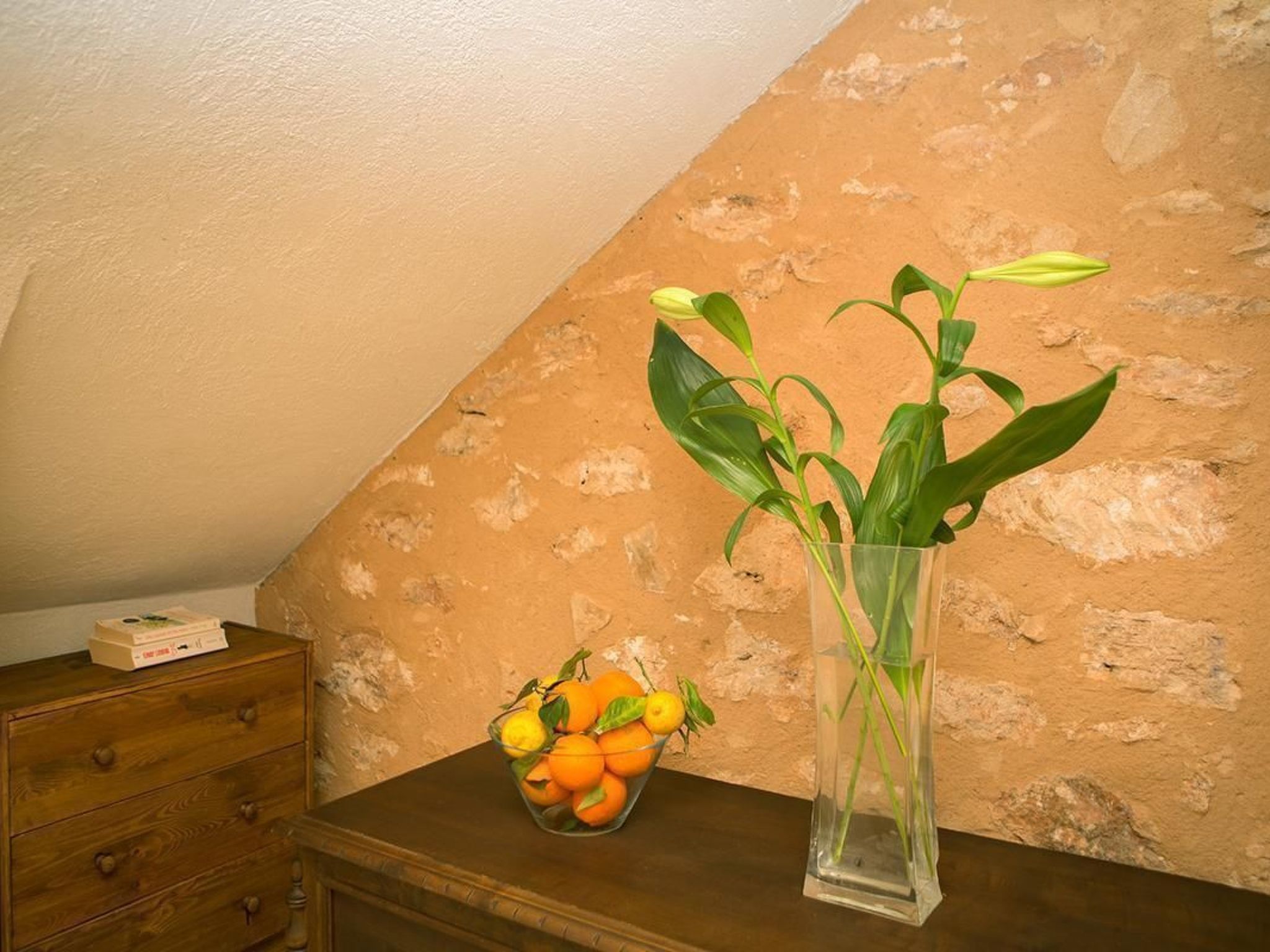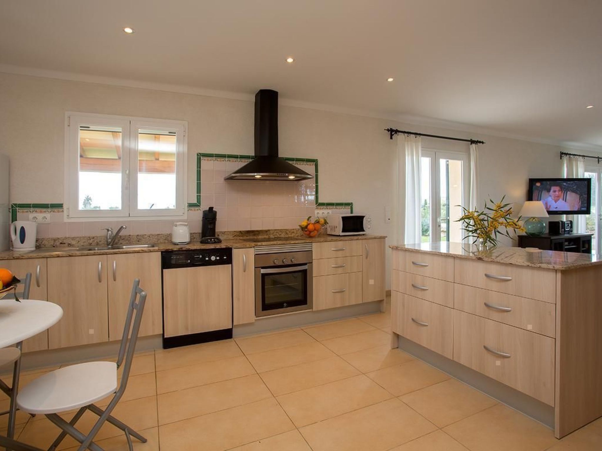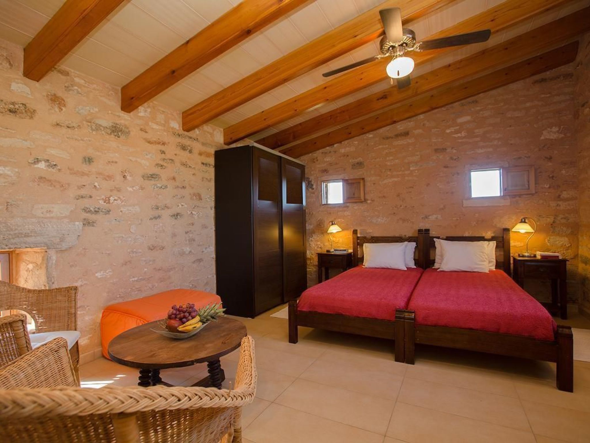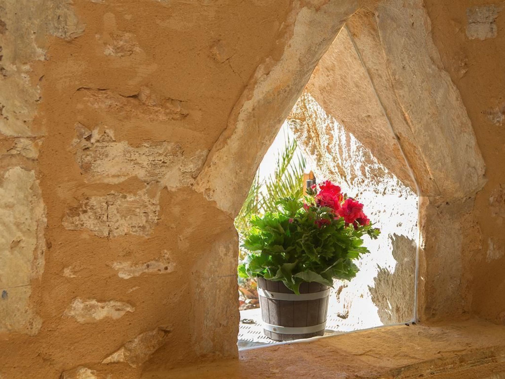 The romantic and exclusive finca is situated in a sought-after location and is newly and lovingly renovated. On the ground floor there is an open-plan living-dining room and kitchen, totalling 55.80m² with air conditioning (hot and cold), two sofas (one of which is a sofa bed for two people measuring 140 x 200cm), wood-burning stove (firewood available), large flat-screen TV (42') with satellite antenna, CD player, + radio, free Internet (W-Lan). There is also a dining table for six people plus baby chair. The fully equipped, modern kitchen with ceramic hob, dishwasher, oven, fridge with freezer compartment, microwave, two coffee machines (espresso and Melitta), kettle. Crockery and cutlery for 12 people also has air conditioning. Also on the ground floor is a bedroom (14.90m²) with double bed (160 x 200cm) and baby cot on request, with air conditioning (hot and cold) and ceiling fan. There is also a shower room with WC, washbasin and large shower (5.35m²). On the upper floor is the second bedroom with two beds (each 90 x 200cm) a small table with two straw armchairs and a folding bed for a child), totalling 23.25m², also air-conditioned (hot and cold) and ceiling fan, integrated shower room with WC, washbasin and large shower (6.65m²) and access to the roof terrace (62.85m²).