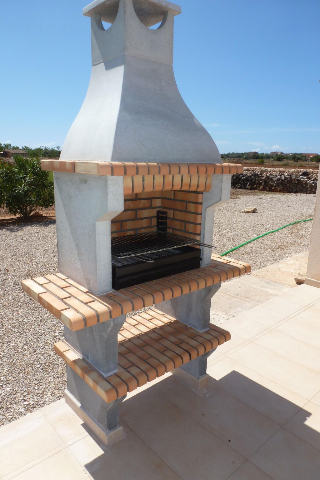 From the dining room/kitchen or the bedroom there is access to the sunny patio (78m²) with a table for six and a fig tree for shade, also from the kitchen/dining room there is access to the front terrace (62m²) with a dining table for six under a canopy and an uncovered part with a barbecue and six sun loungers. In front of this is the lawned area with pool (3.25 x 7.50m) and a shower. From the kitchen there is access to the large laundry/storage room with washing machine and from there to the covered car parking area and the entrance to the finca.