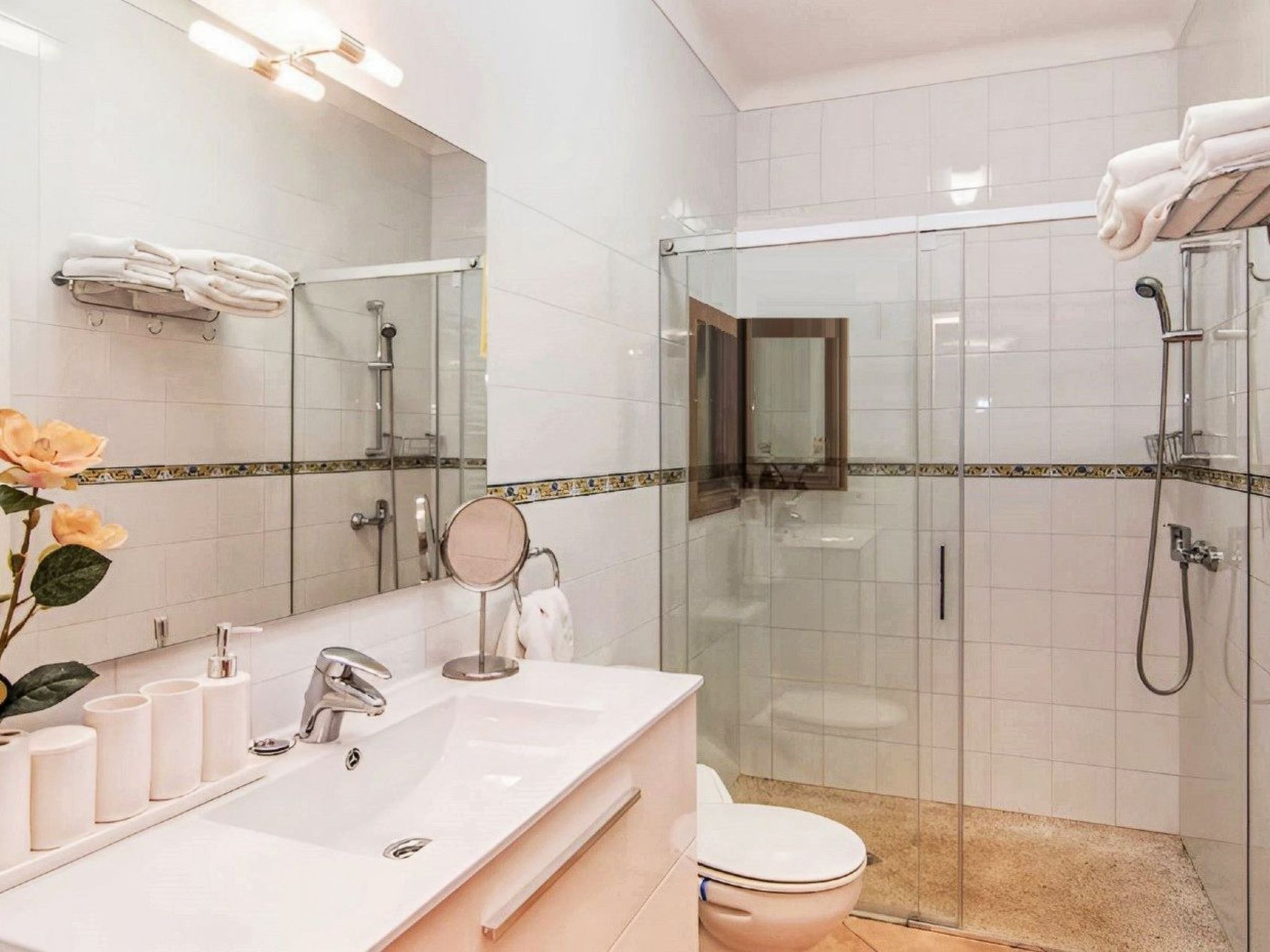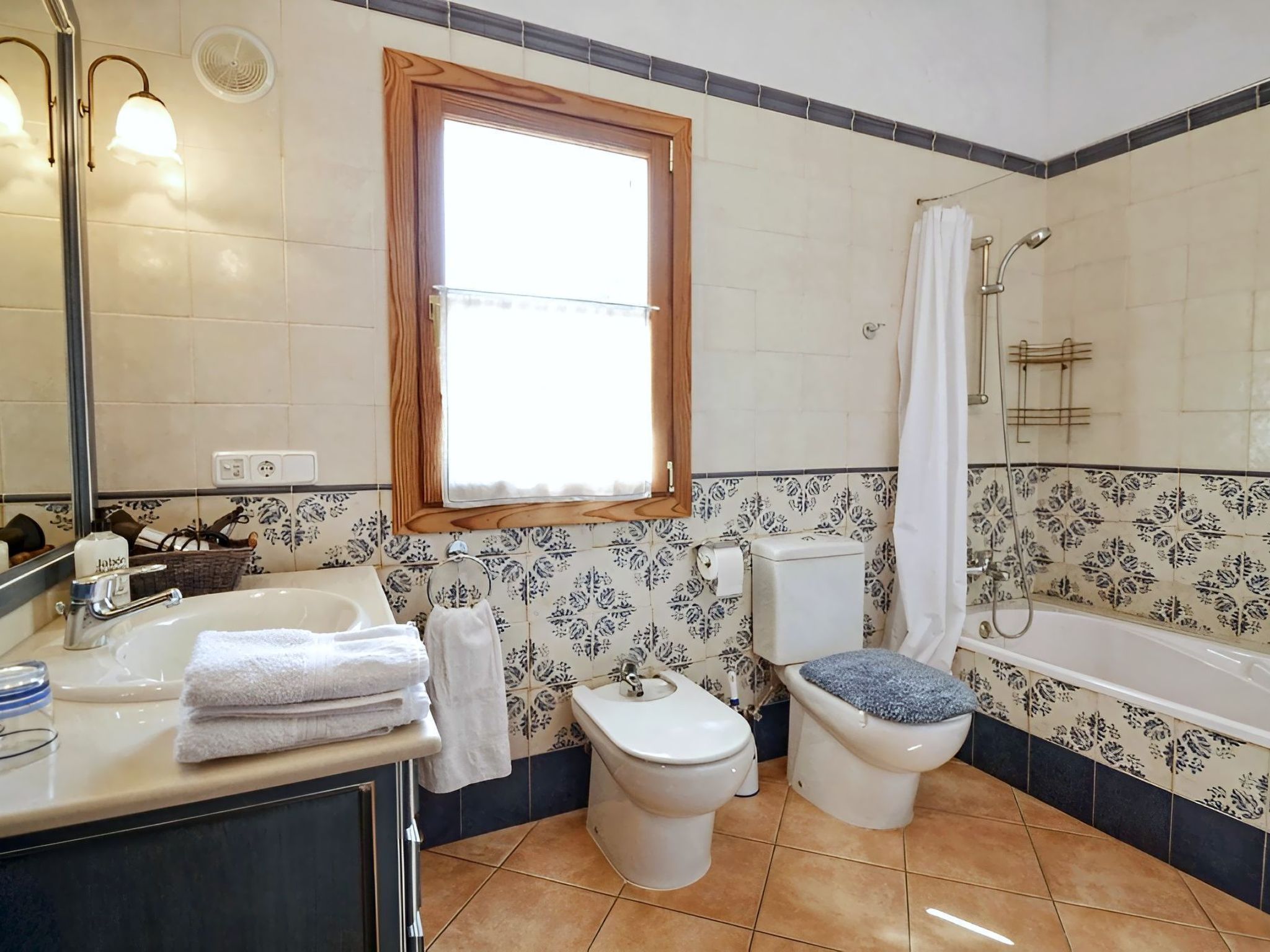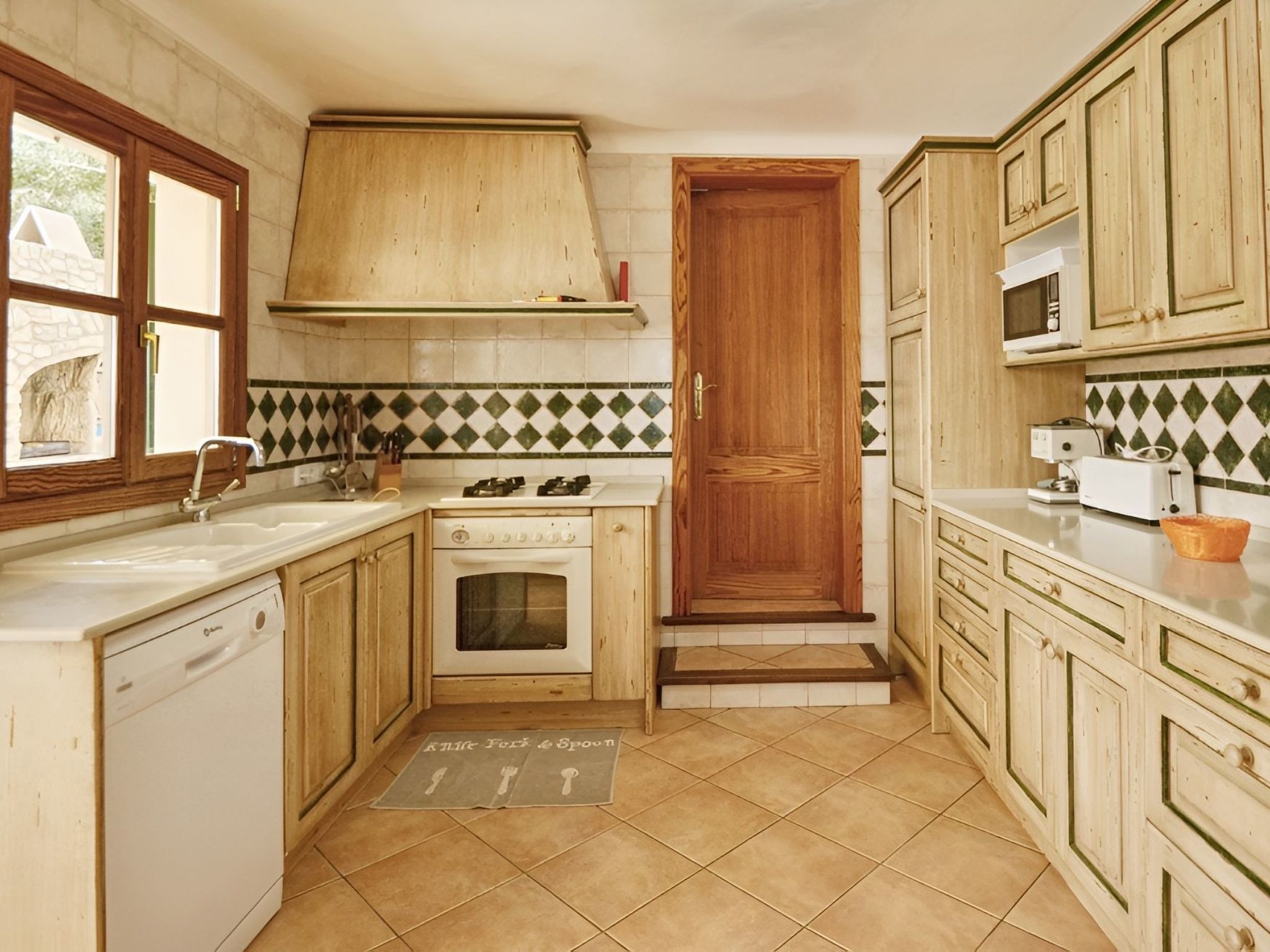 Il y a au total 3 salles de bains, 1 avec douche au rez-de-chaussée, 1 avec douche dans la baignoire au premier étage, et la troisième se trouve à l'extérieur dans la buanderie sous la piscine. Au rez-de-chaussée se trouve le salon spacieux et lumineux avec télévision par satellite et Internet WiFi, ainsi que la cuisine, équipée d'un lave-vaisselle et donnant accès à la terrasse de la piscine.