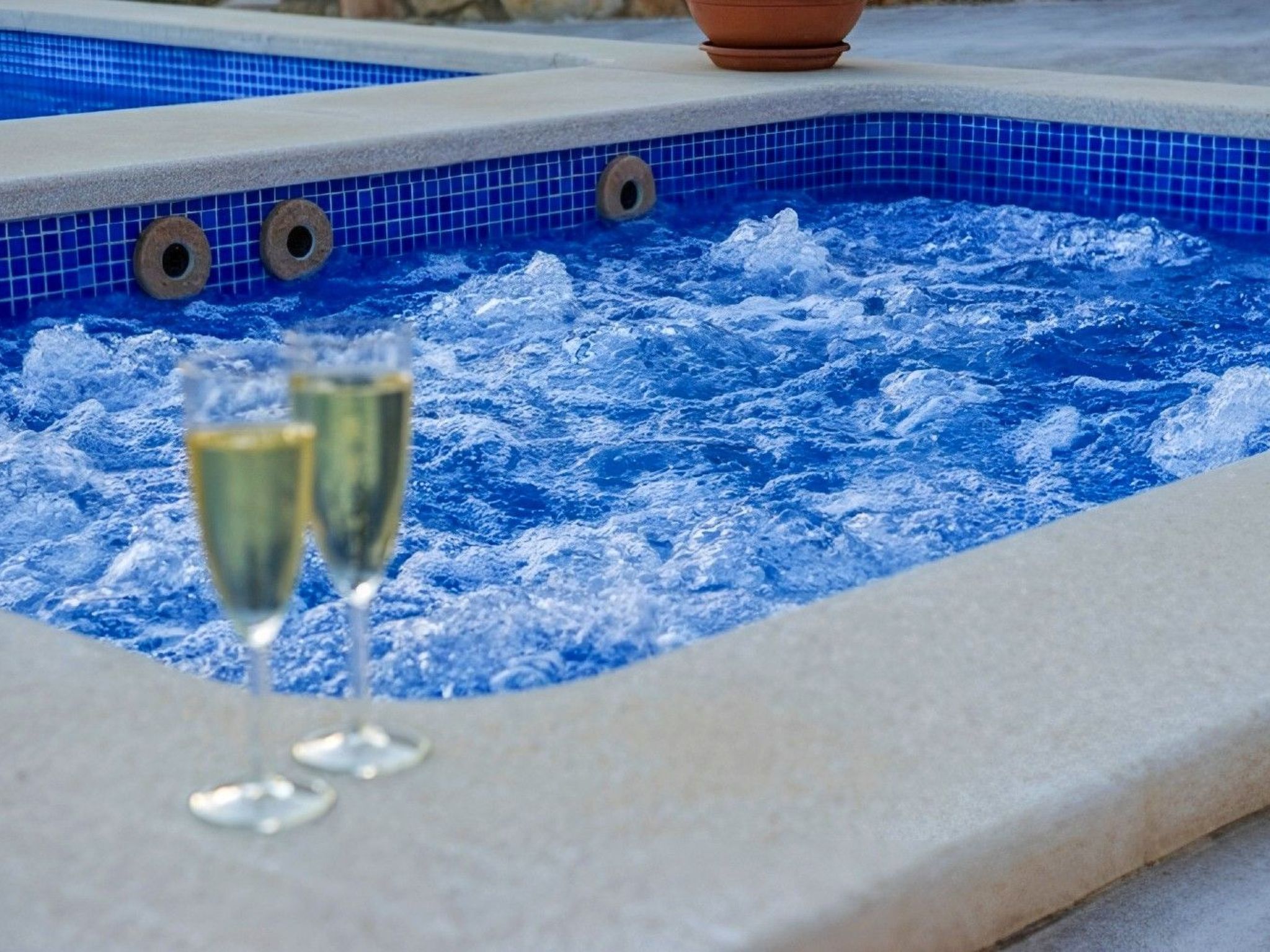 L'immense terrasse abrite la piscine de 9 m x 5 m (profondeur 1,60 m) et un jacuzzi intégré de 2 m x 3 m (profondeur 0,60 m). De là, vous pouvez profiter d'une vue de rêve sur les montagnes environnantes et, lorsque la visibilité est bonne, même jusqu'à la mer. Le point fort est la cuisine extérieure couverte avec grill, table à manger et lave-vaisselle. Il y a même une télévision et une table de ping-pong.