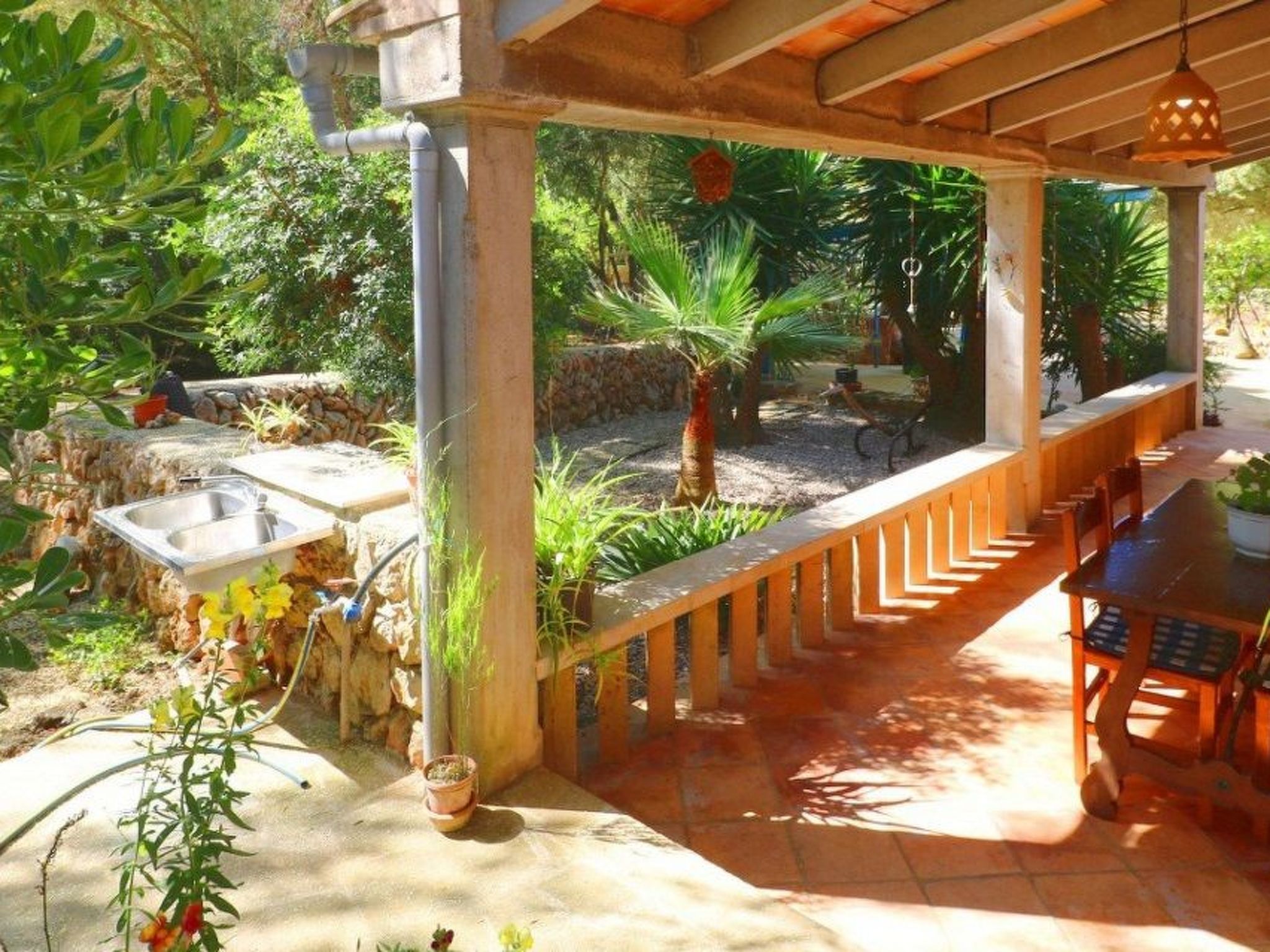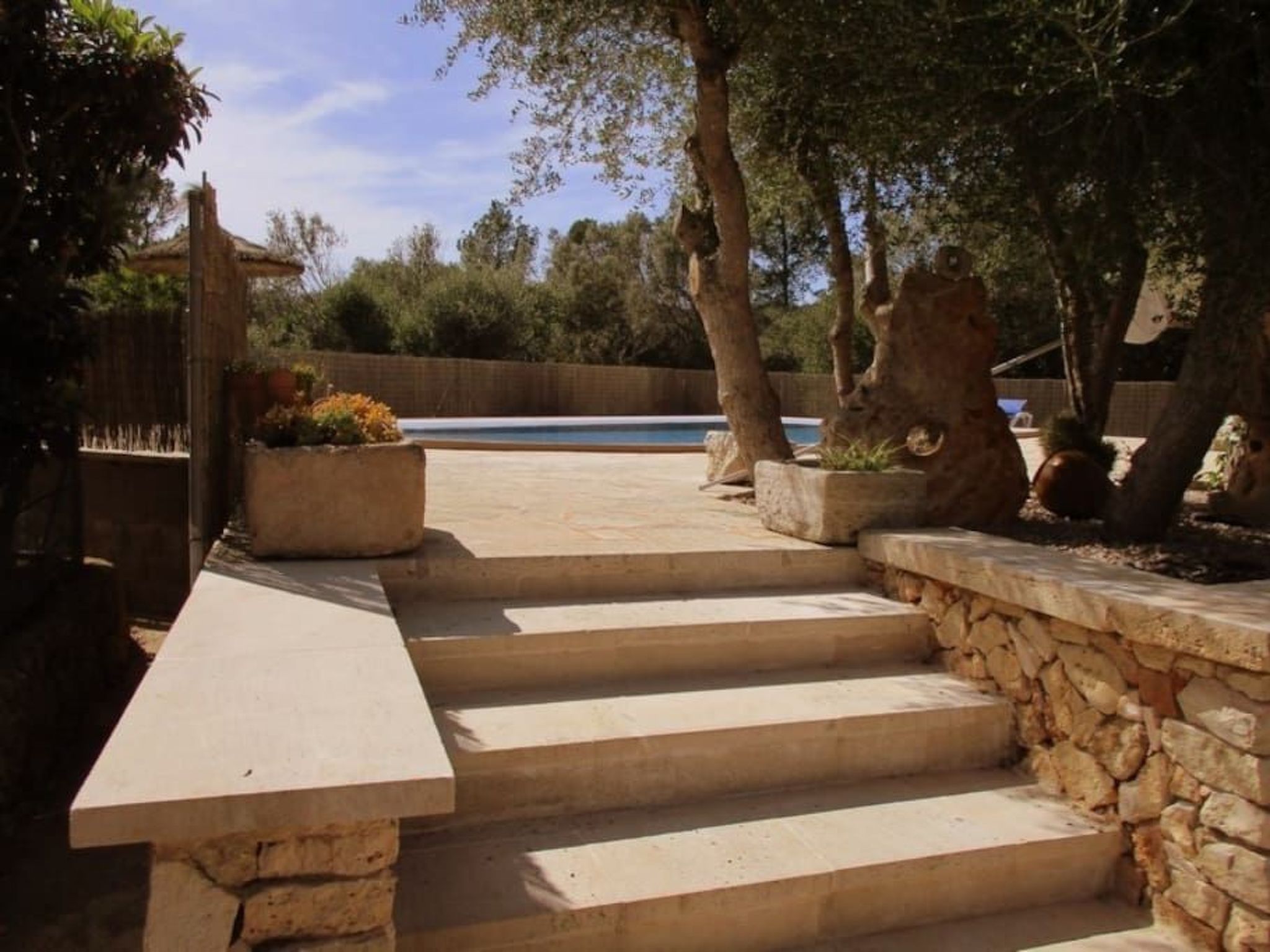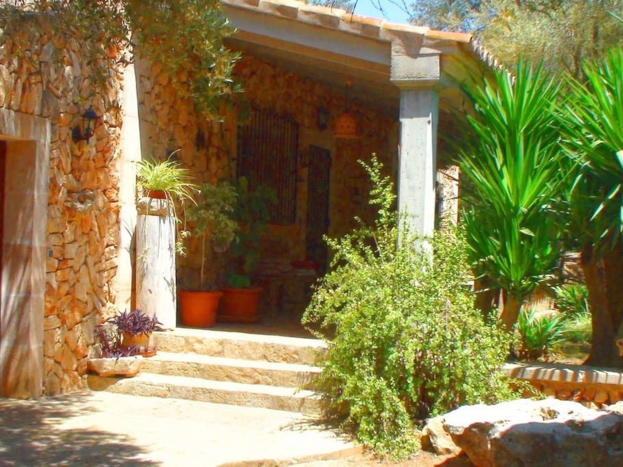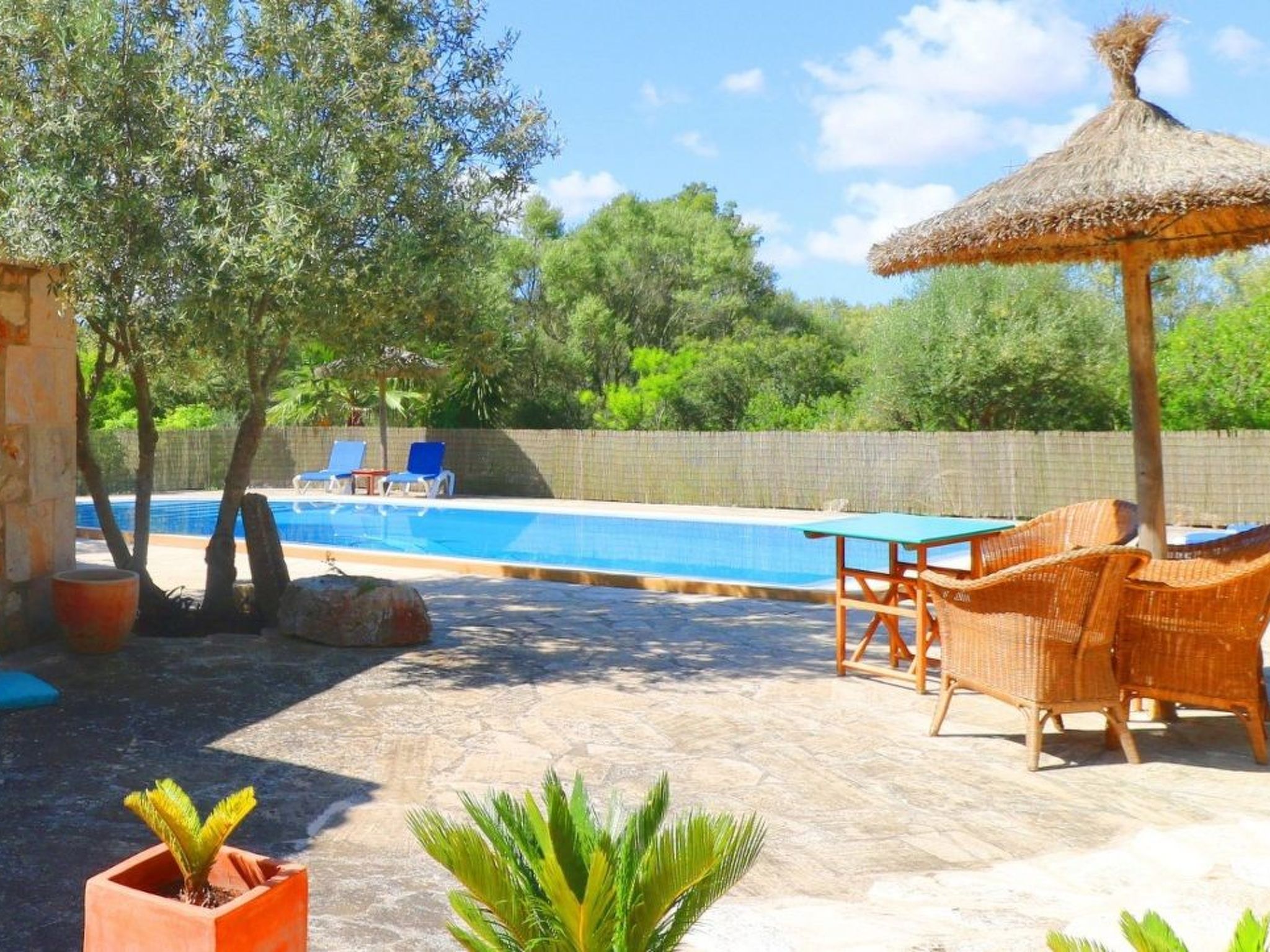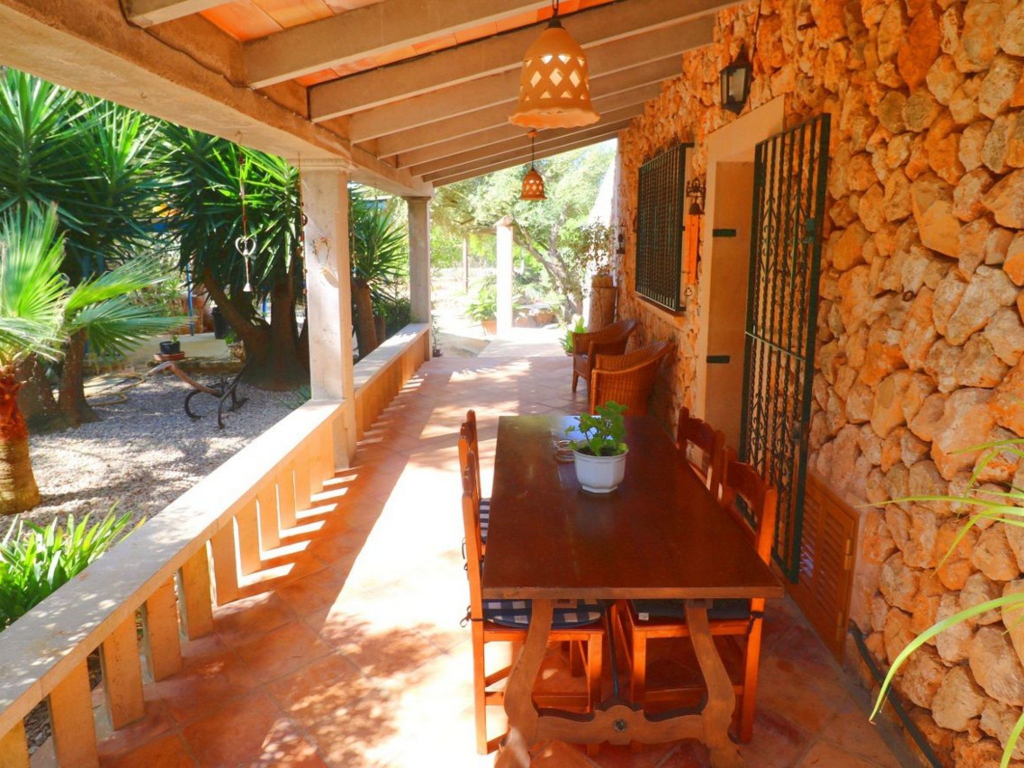 Finca Alfabia - small pool finca with a large garden and lots of greenery near the village of Campos. The typical Mallorcan-style house has three (!) bedrooms, 3 (!) bathrooms, living and dining room and a large kitchen. The garden, in which the large pool is located, offers shady and cosy places to relax. Sunbathing is possible on the spacious pool terrace. The house offers enough space to accommodate three people and a baby and is within easy reach of the popular town of Campos. There are numerous shops, restaurants and cafes. Some large retail chains have a location in Campos. The "home beach" of Campos is Es Trenc beach in the south of the island, a long sandy beach with dunes in front of turquoise-coloured water.