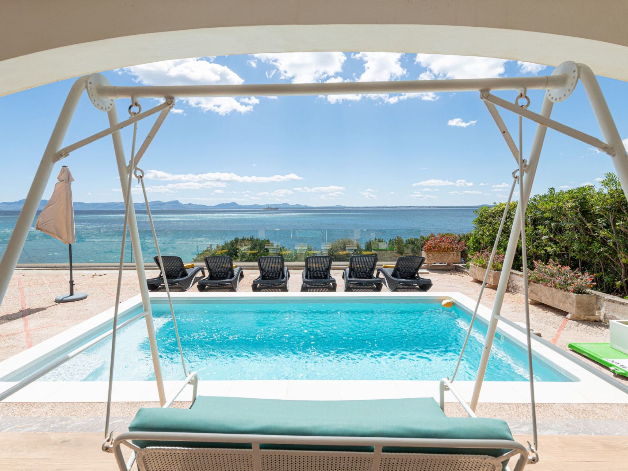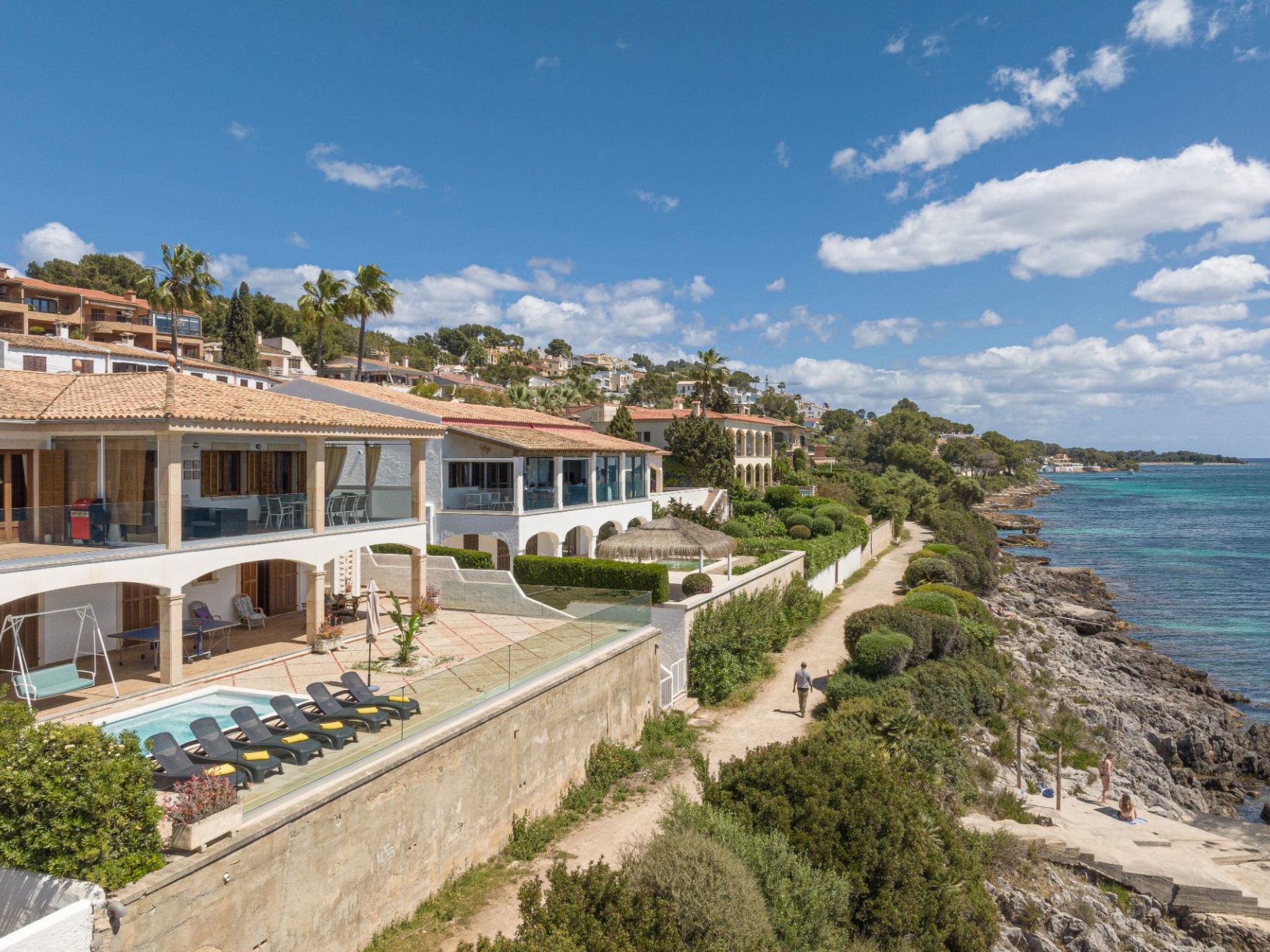 The villa's heart beats strongest in its expansive outdoor living spaces. Luxuriate on the solarium, engage in playful ping-pong matches, or unwind under a covered terrace with a book against the backdrop of gentle sea waves. From the private pool to the al fresco dining areas, each corner invites relaxation and enjoyment against the panoramic bay views. The direct sea access to a secluded rock cove offers a unique touch to your stay, blending adventure with the comfort of home.