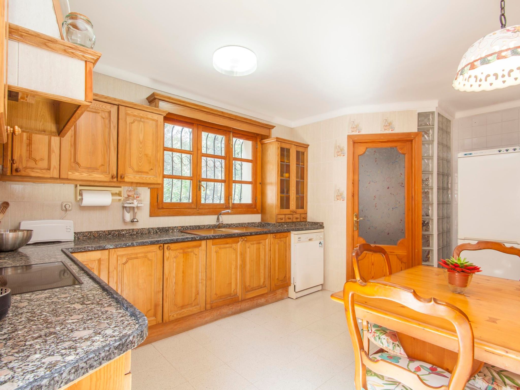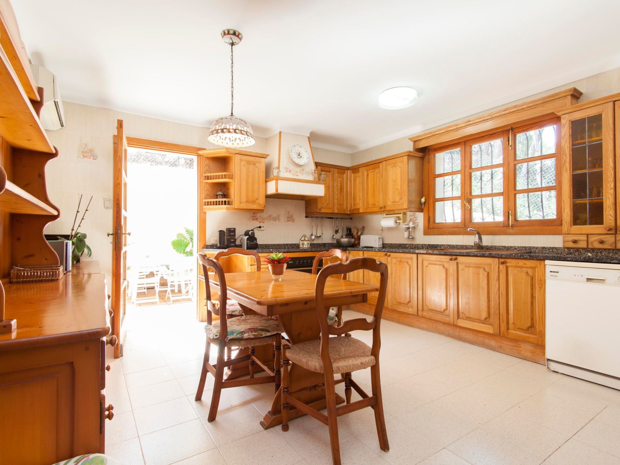 The kitchen is fully equipped with cooker, refrigerator, microwave, toaster, coffee maker, blender and dishwasher.