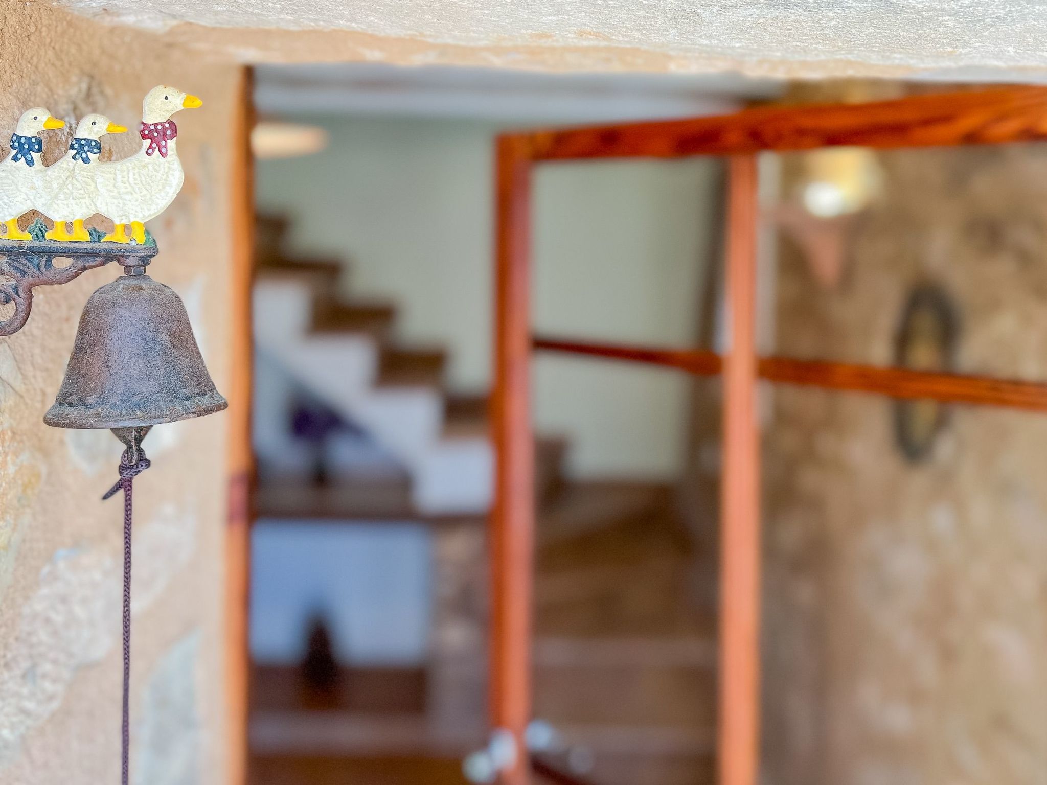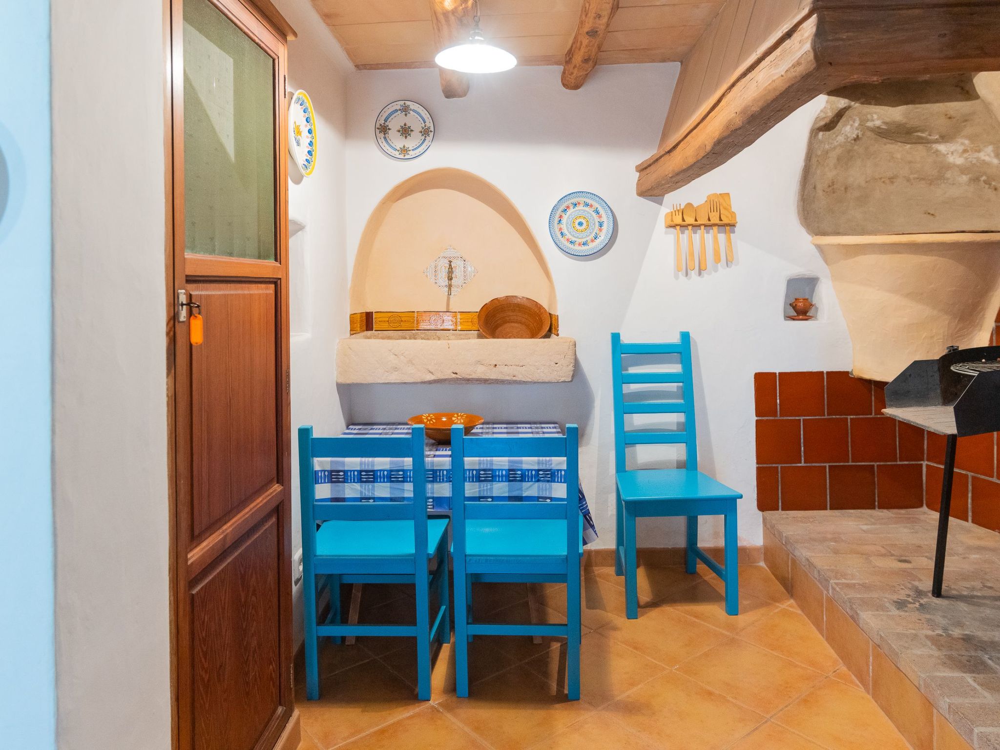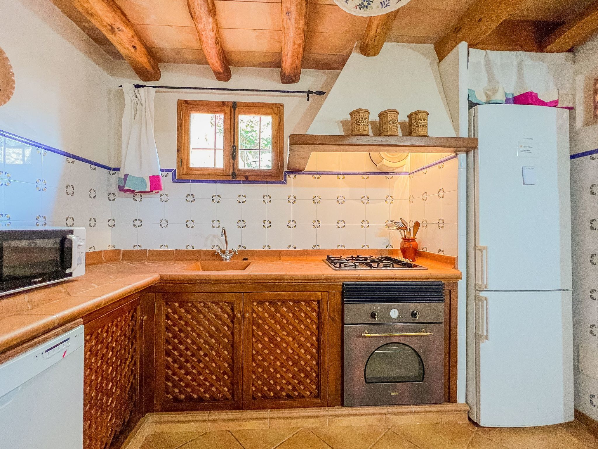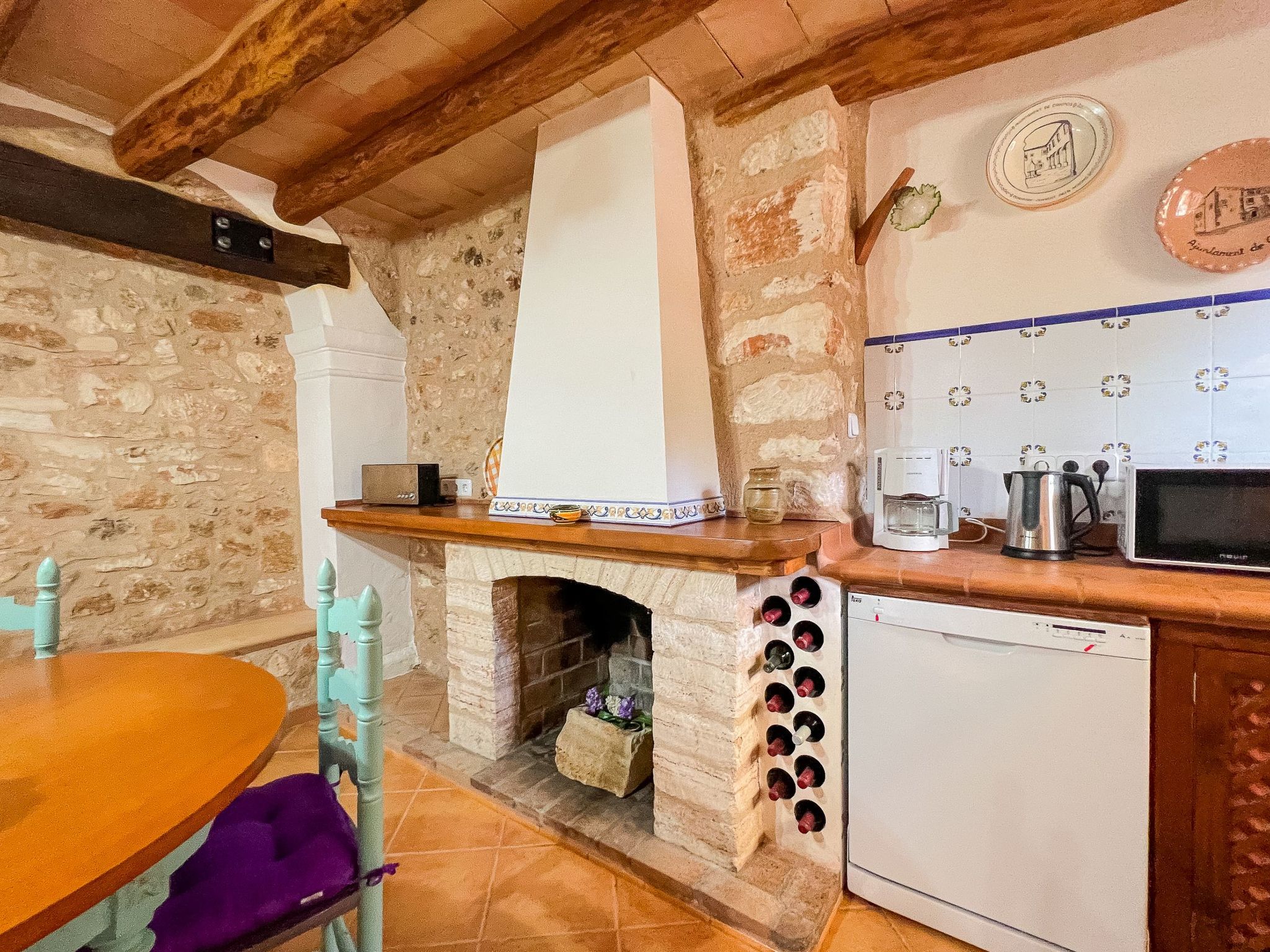 Ground floor: Entrance through a beautiful terrace leading to the living room with satellite TV, a traditional kitchen with fireplace (decorative only) and a pantry, a bright kitchen (4 ring electric oven, microwave, freezer, dishwasher, coffee machine, toaster) with dining area for up to 6 people. A stone staircase leads from the kitchen to the terrace, where you will find a beautiful furnished terrace (approx. 30 m²) with a small garden. Reservations for groups under 25 years of age are not permitted. Failure to comply with this rule will result in non-admission at check-in.