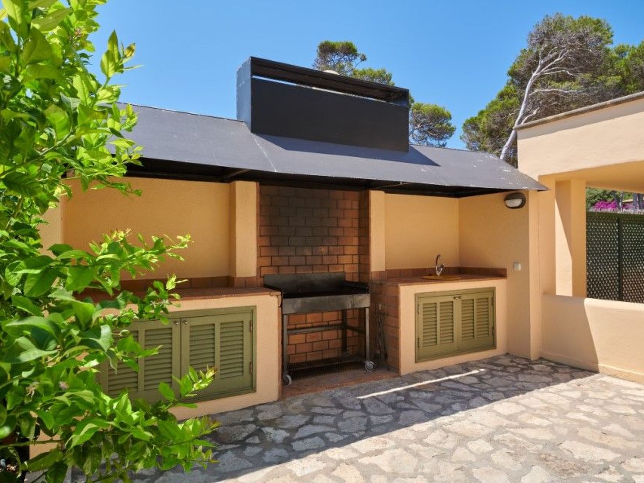 The exterior of this detached holiday home is a dream come true. The private garden, surrounded by majestic pine trees, invites you to spend relaxing hours in nature. The swimming pool, which is for exclusive use, offers a refreshing dip on hot days, while the spacious terraces provide an ideal place for socialising or simply sunbathing.