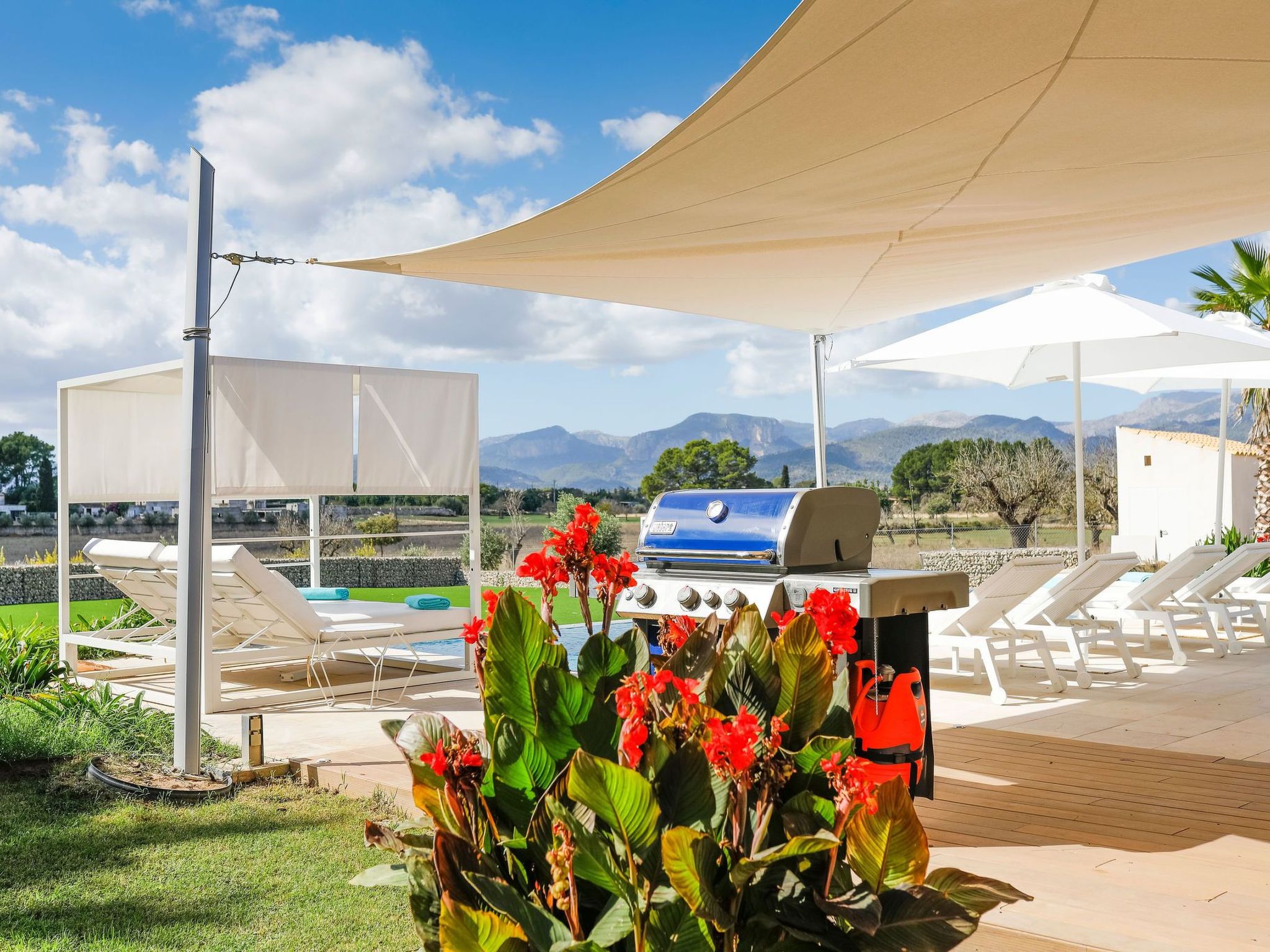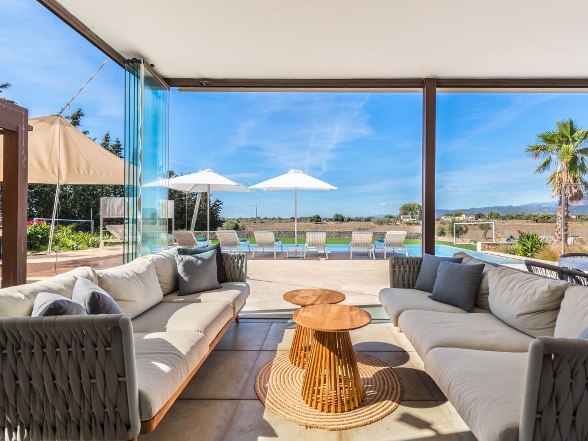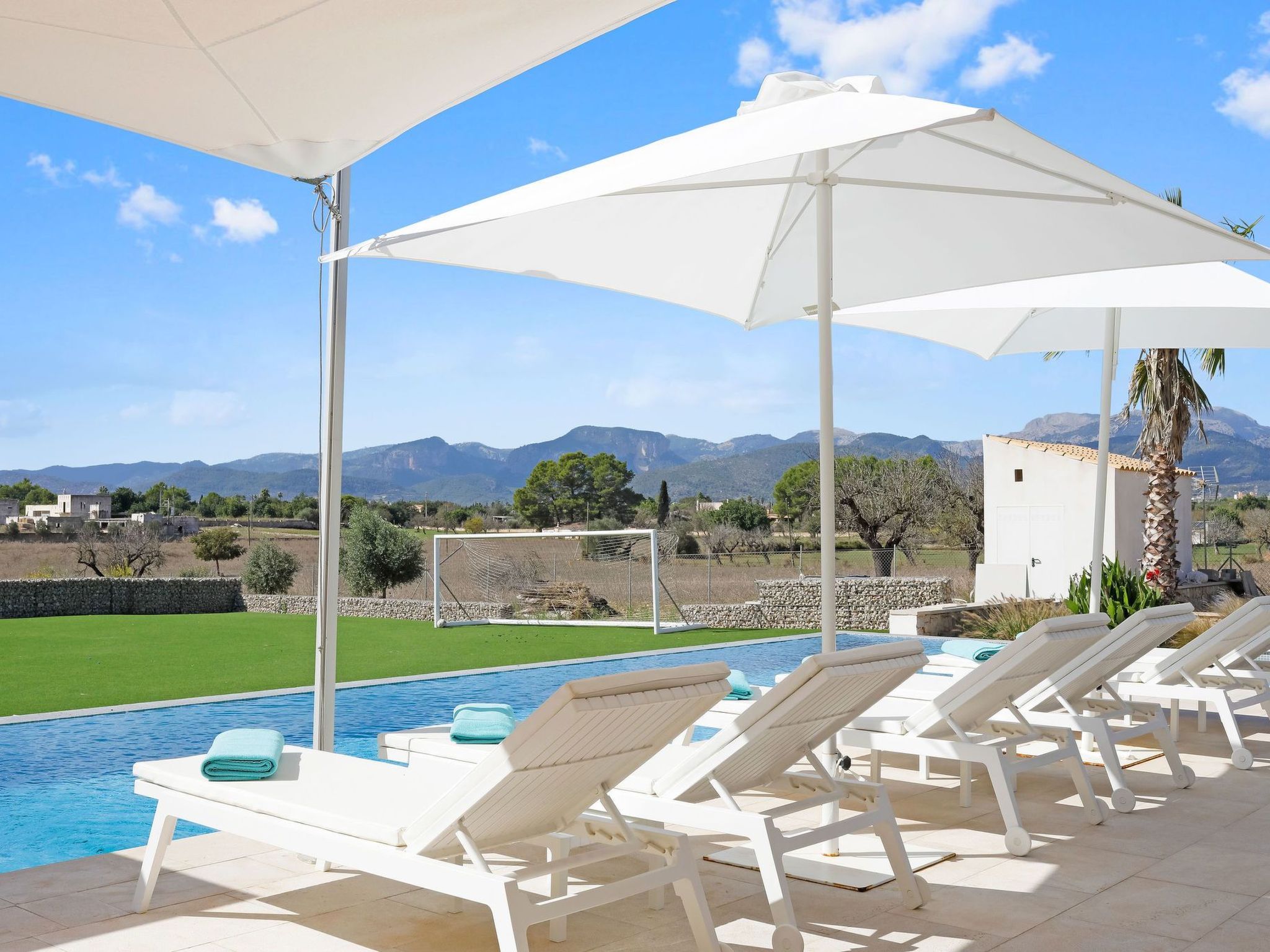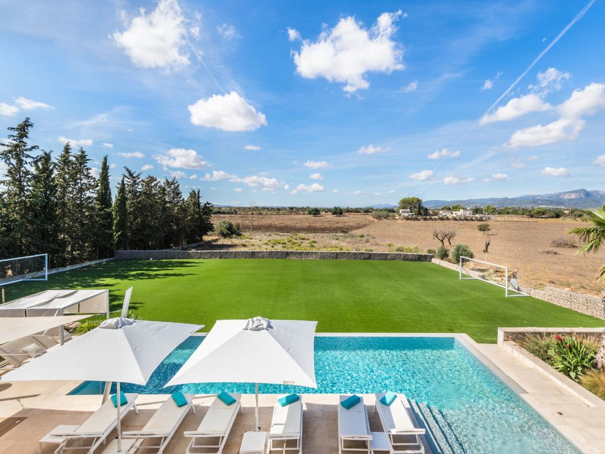 Outdoors, the property opens up to a world of leisure and relaxation. The spacious terrace invites you to soak up sunny days with its luxurious sun loungers, chill-out area and outdoor dining area perfect for al fresco dining. The outdoor kitchen, complemented by a bar and barbecue bar, promises memorable evenings under the Mallorcan sky. The heated swimming pool and children's football pitch add further entertainment and fun options to your stay.