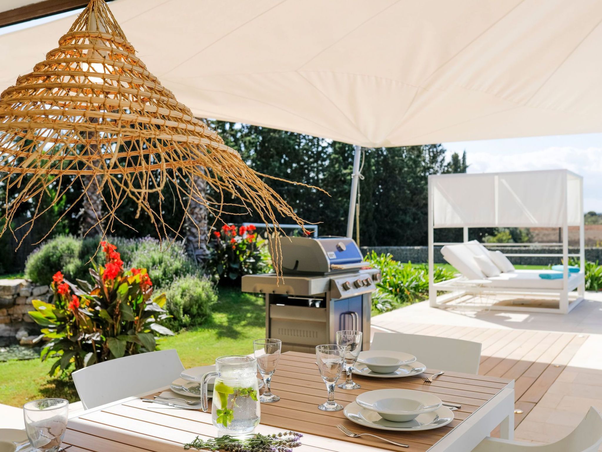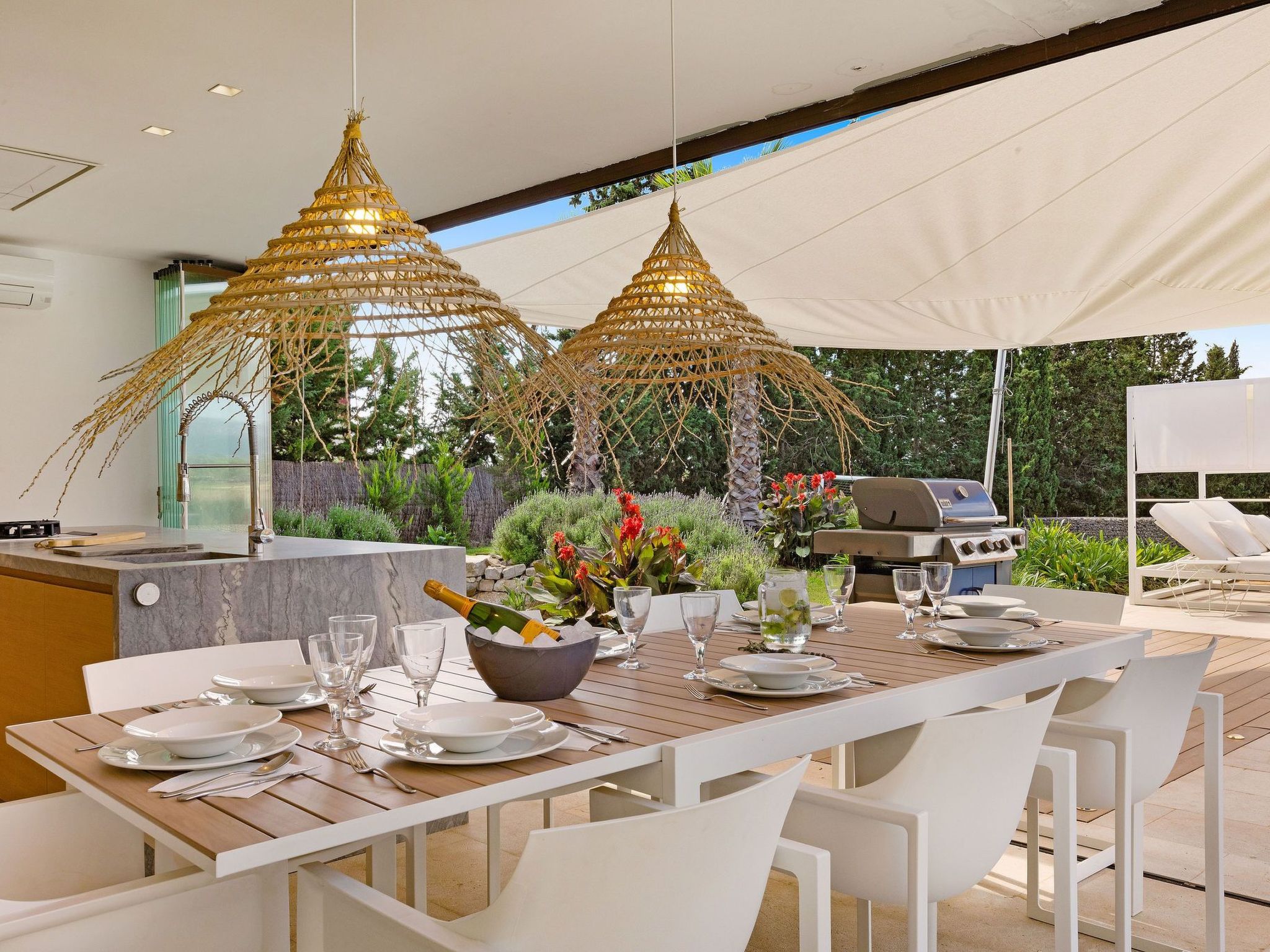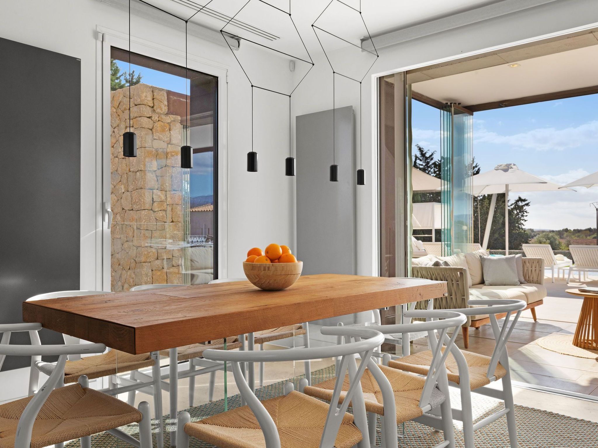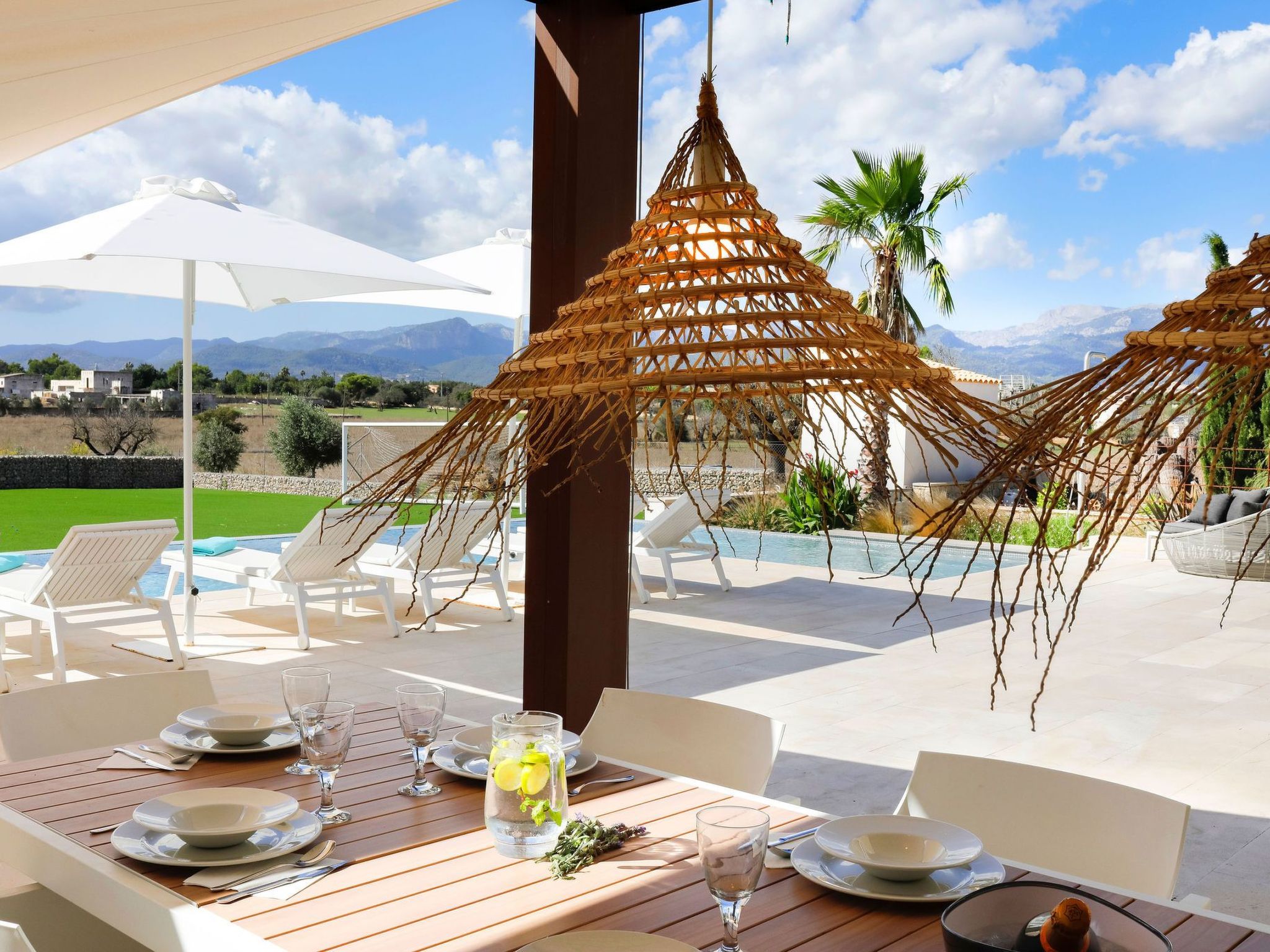 Outdoors, the property opens up to a world of leisure and relaxation. The spacious terrace invites you to soak up sunny days with its luxurious sun loungers, chill-out area and outdoor dining area perfect for al fresco dining. The outdoor kitchen, complemented by a bar and barbecue bar, promises memorable evenings under the Mallorcan sky. The heated swimming pool and children's football pitch add further entertainment and fun options to your stay.