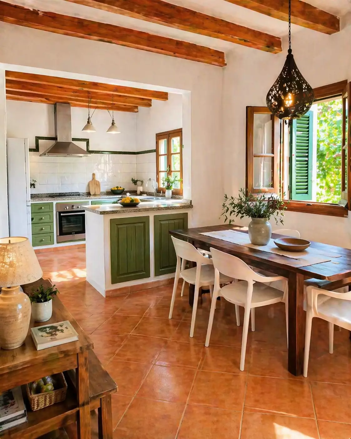 L'intérieur offre un salon accueillant, une salle à manger lumineuse avec accès à l'extérieur et une cuisine indépendante entièrement équipée, idéale pour les séjours courts comme longs.