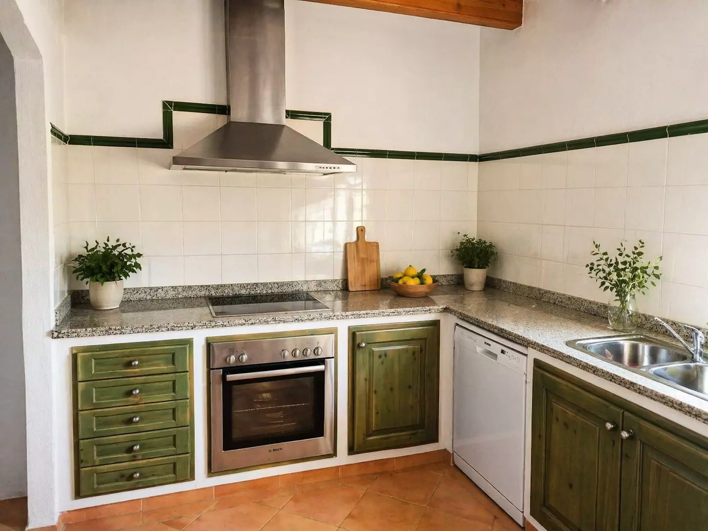 Cuisine complète avec four, micro-ondes, lave-vaisselle, réfrigérateur, congélateur, cafetière, bouilloire, grille-pain, mixeur, cuisinière, ustensiles de cuisine et barbecue, vaisselle complète, verres à vin, plateau de pâtisserie et vaisselle pour enfants.