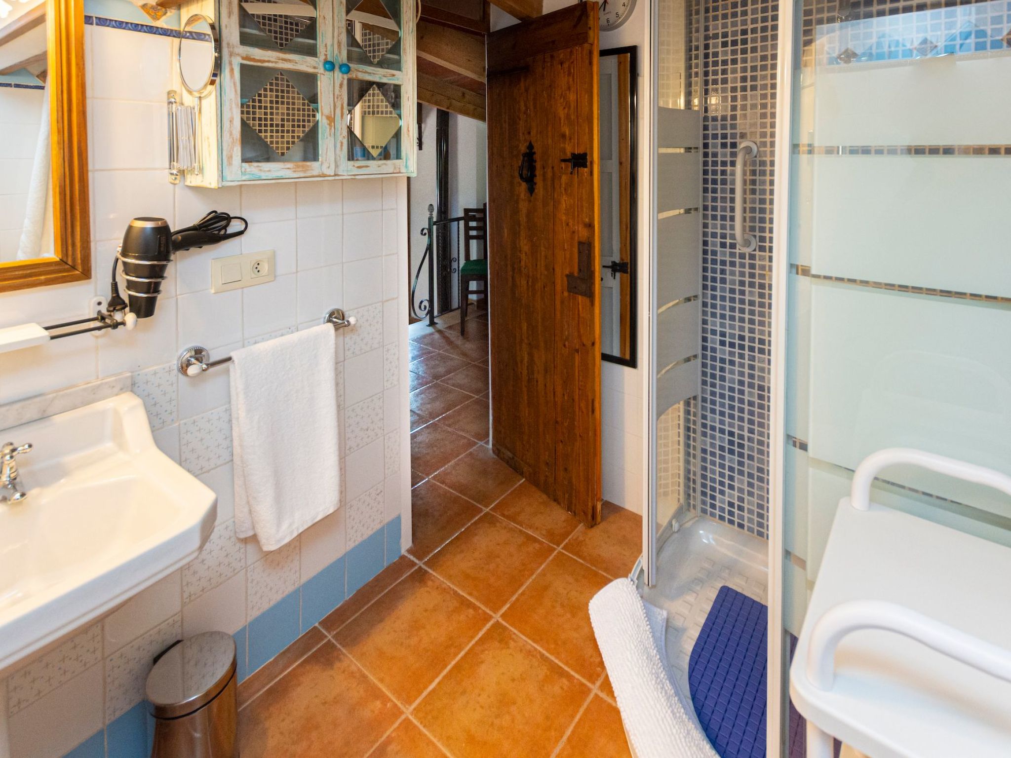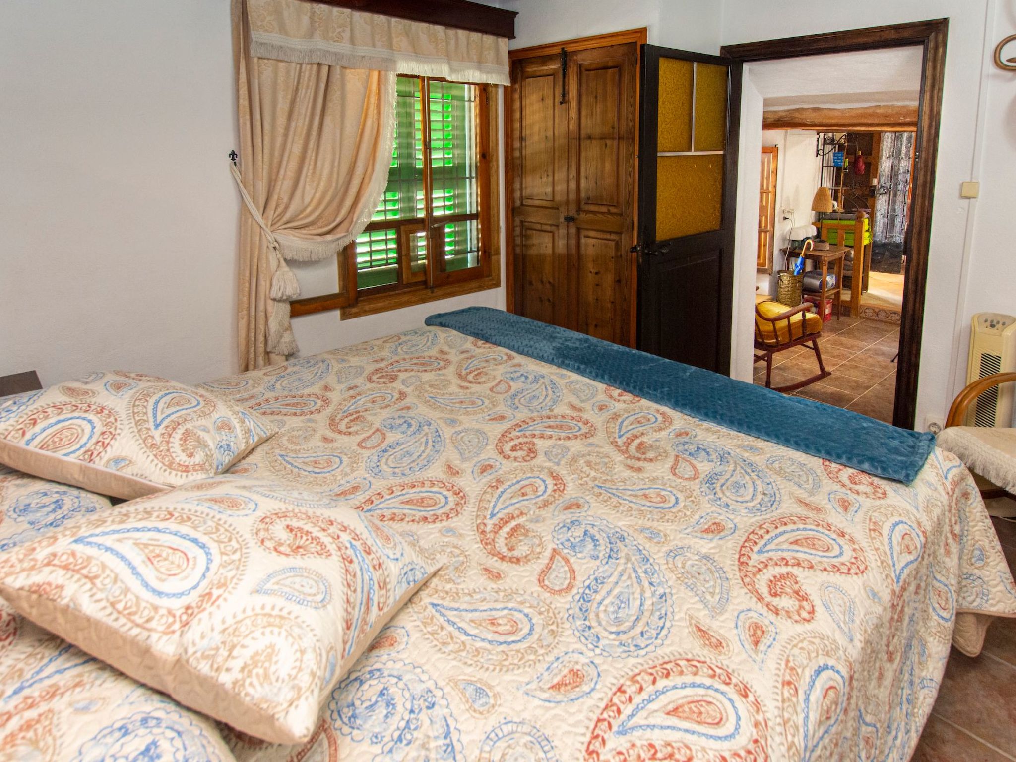 Internally, the villa is distinguished by its spacious living/dining room with fireplace, a sitting room with comfortable sofas and an additional sitting room behind a beautiful wooden staircase, creating a rustic and comfortable atmosphere. The kitchen, spacious and perfectly equipped, maintains the Majorcan character with a beautiful old fireplace. The ground floor is completed with bedrooms furnished for an ideal rest, such as a bedroom with a large double bed and a twin room with two single beds, both close to a full bathroom with bathtub and shower, providing modern comforts in a traditional setting. An entertainment room with a fireplace, comfortable sofas and a large television, plus a fully equipped covered barbecue, ensure entertainment and enjoyment whatever the season.