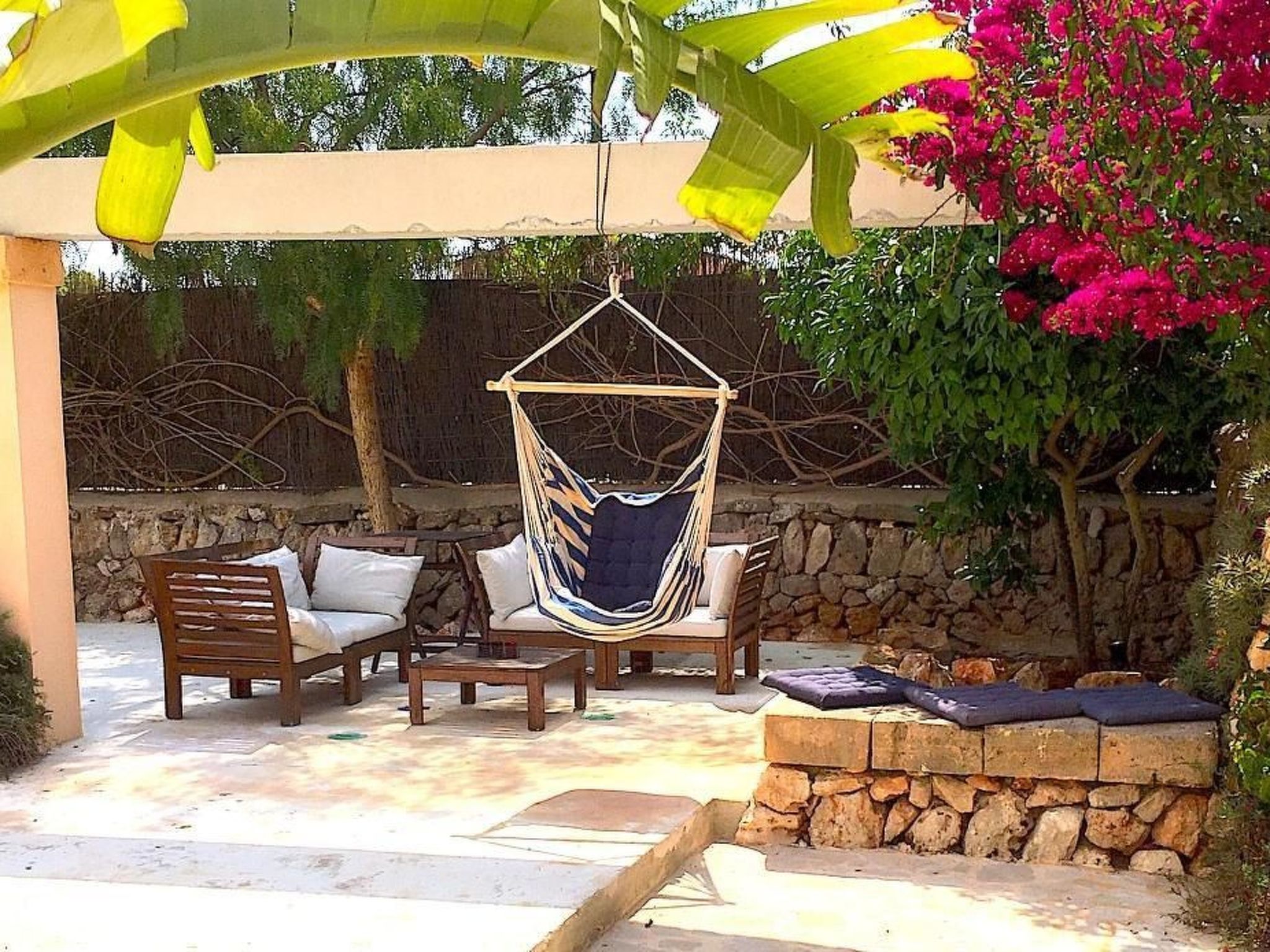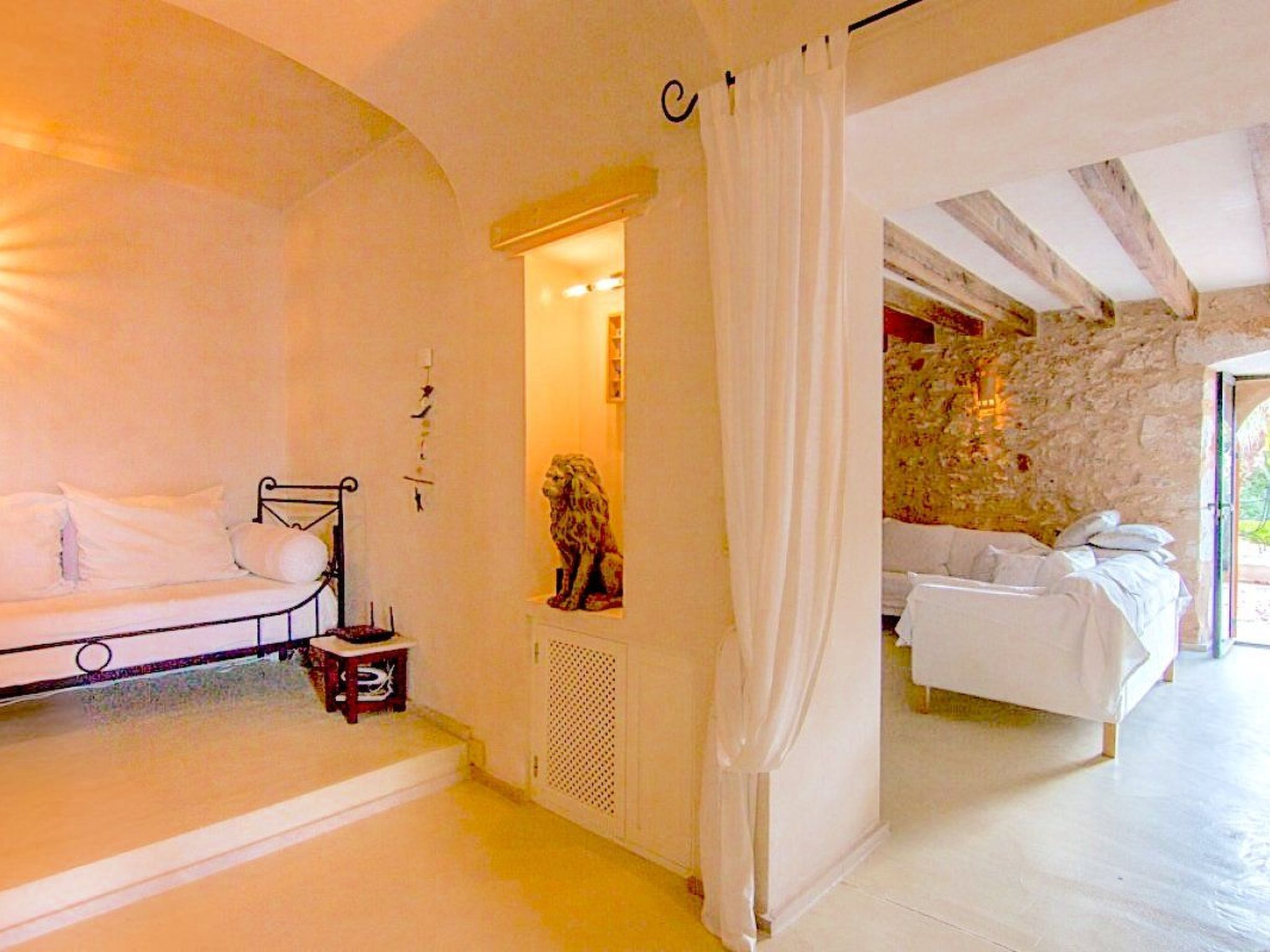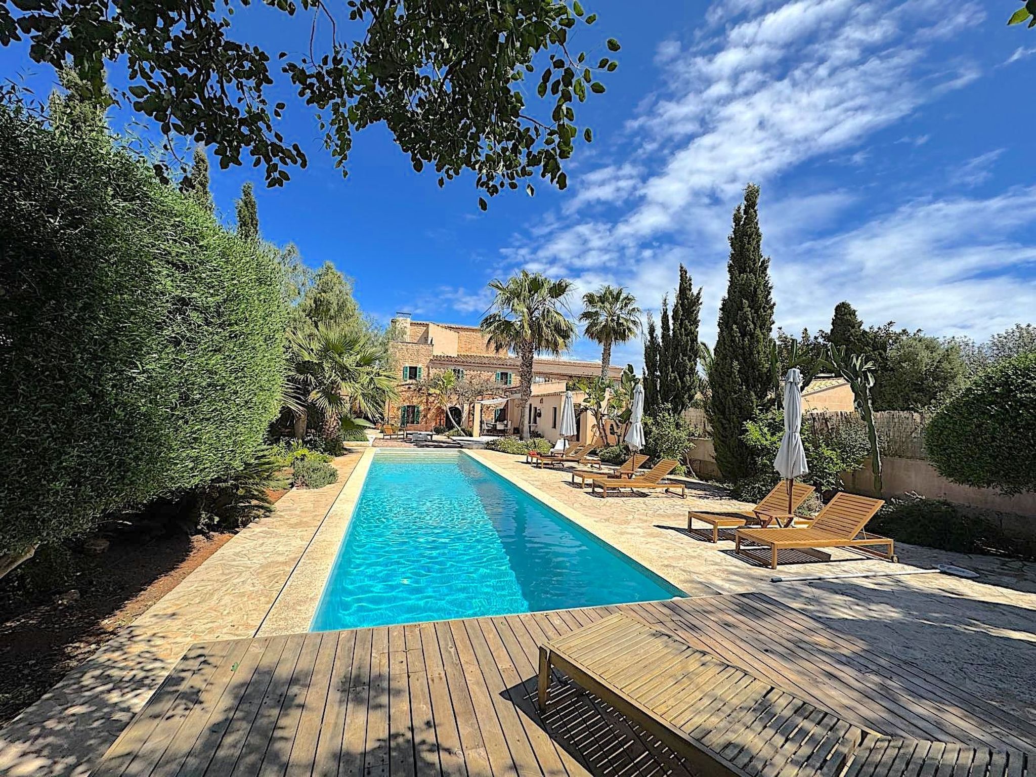 Treat yourself to an idyllic break in our charming holiday home Casa 3 Leones in Es Llombards. Perfectly designed for up to 6 people, this inviting domicile is the ideal base from which to explore the beaches and beauty of Mallorca. The house - whose origins date back to the beginning of the last century - has been converted into a comfortable holiday home. The original structures were largely retained, but modern materials were used to bring them up to the latest state of the art. The result is a rural village house in finca style with a living space of approx. 214 square metres. Inside, Casa 3 Leones presents itself on the ground floor with a modern living room and a spacious dining area with AC. Entertainment is well catered for thanks to the Smart TV. The open-plan kitchen invites you to prepare delicious meals with a comprehensive range of appliances, including various coffee machines, a ceramic hob and a side-by-side fridge. The ground floor also has a shower room at ground level and an alcove with a daybed that can be used as a bed for residents who are unable to access the upper floor. This makes the ground floor suitable for people with limited mobility. The upper floor of the house consists of three cosy bedrooms, all of which can be darkened for a restful night's sleep, as well as two bathrooms, each with a shower, WC and bidet. One half of the entire upper floor, which extends over various levels, is taken up by the generously proportioned master bedroom with en suite bathroom. A particular highlight of Casa 3 Leones is the furnishings, which leave nothing to be desired: Air conditioning units ensure pleasant temperatures in all rooms, while the underfloor heating provides cosy warmth on cooler days. Outside, a private Mediterranean garden with palm trees, cypresses and citrus trees awaits you. The saltwater pool has a length of 13 metres and allows for "real swimming". By the pool there is another bathroom with outdoor shower (h/c) and WC. The various terraces, which invite you to sunbathe and relax outdoors, are largely hidden from view and offer plenty of space for outdoor leisure activities. It is the perfect place to unwind and enjoy the Mallorcan sun. An outdoor kitchen with barbecue, hot water sink, gas cooker, fridge and large dining table in the patio complete the amenities of the house.