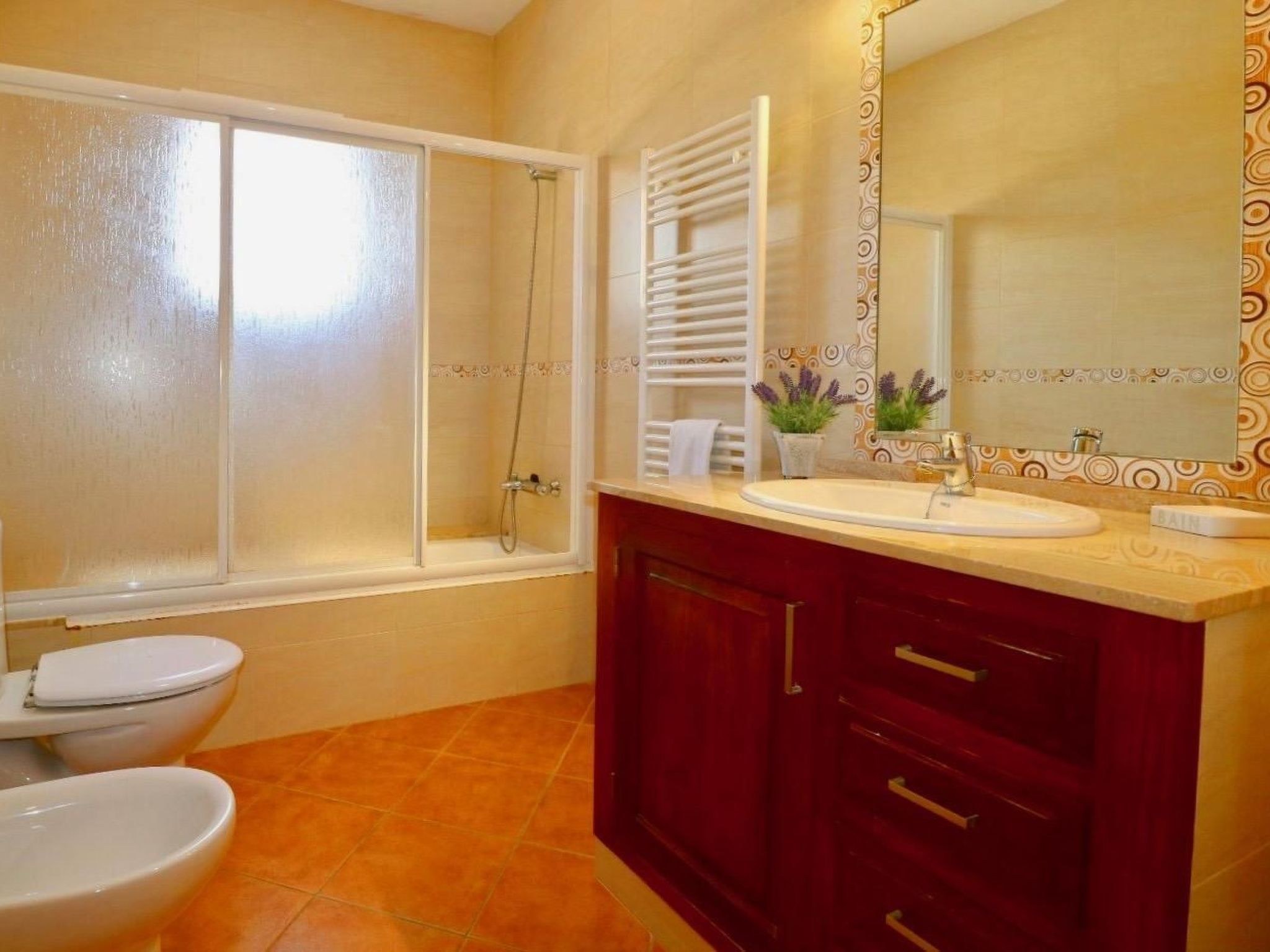 - 1 ensuite2 bathrooms with bath/shower, bidet + WC1 bathroom with showerShower/towels