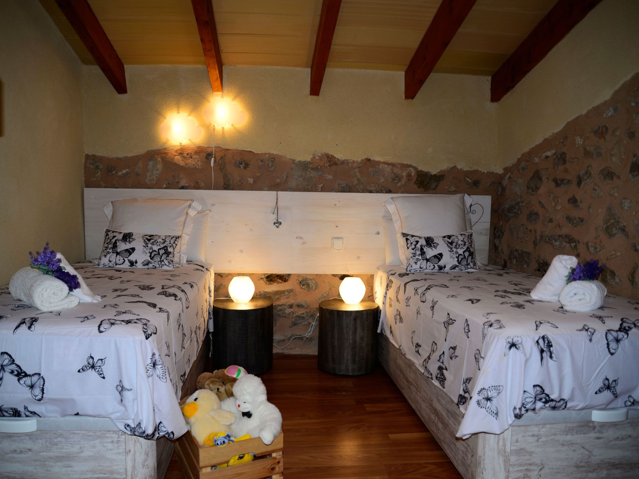 THE UPPER FLOOR CONSISTS OF A LARGE LIVING ROOM WITH TV, BATHROOM AND 2 BEDROOMS (ONE DOUBLE AND ONE WITH BUNK BEDS, BOTH WITH AIR CONDITIONING).